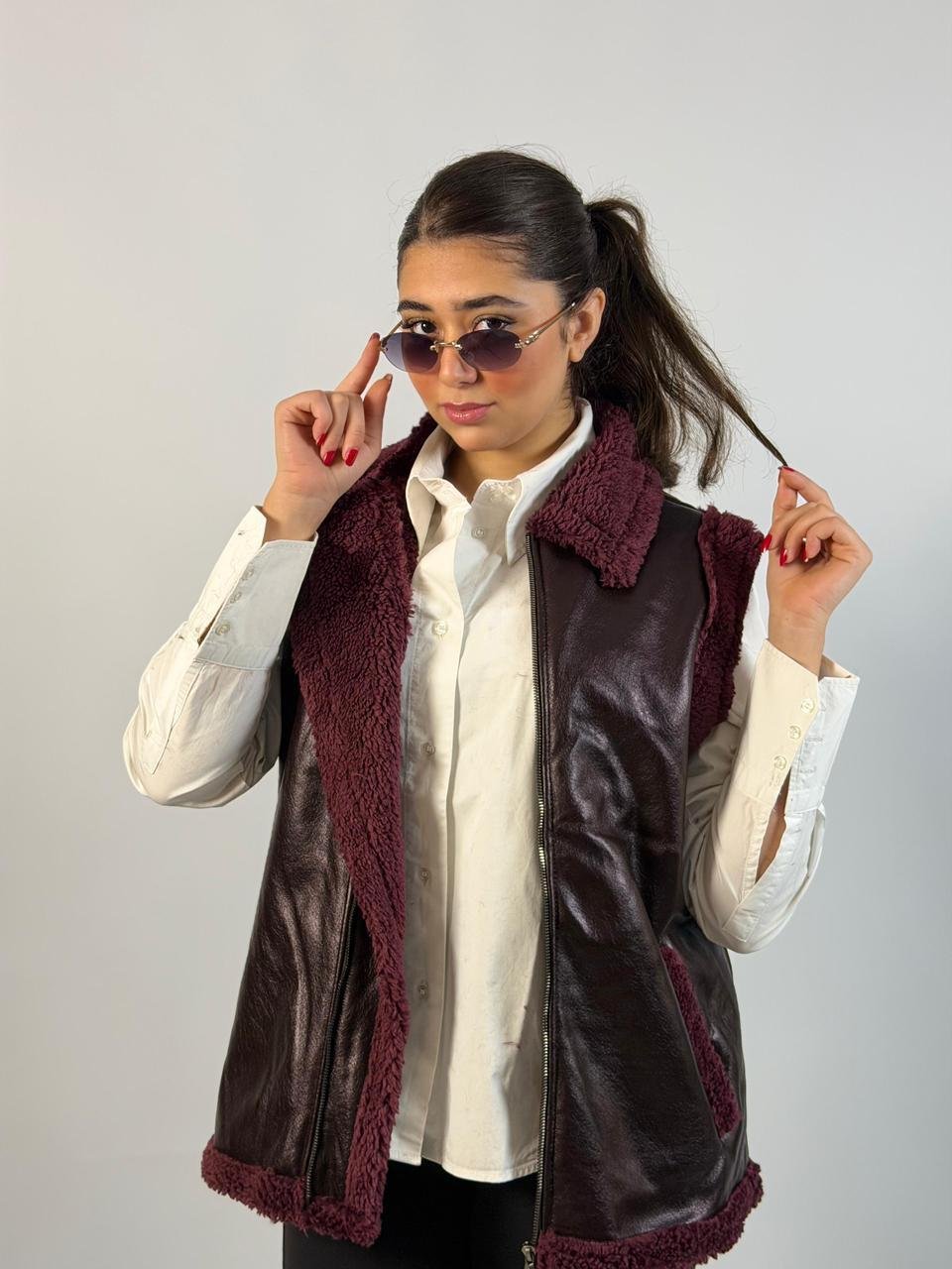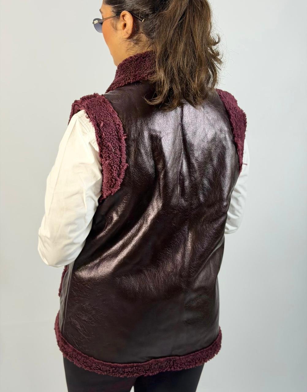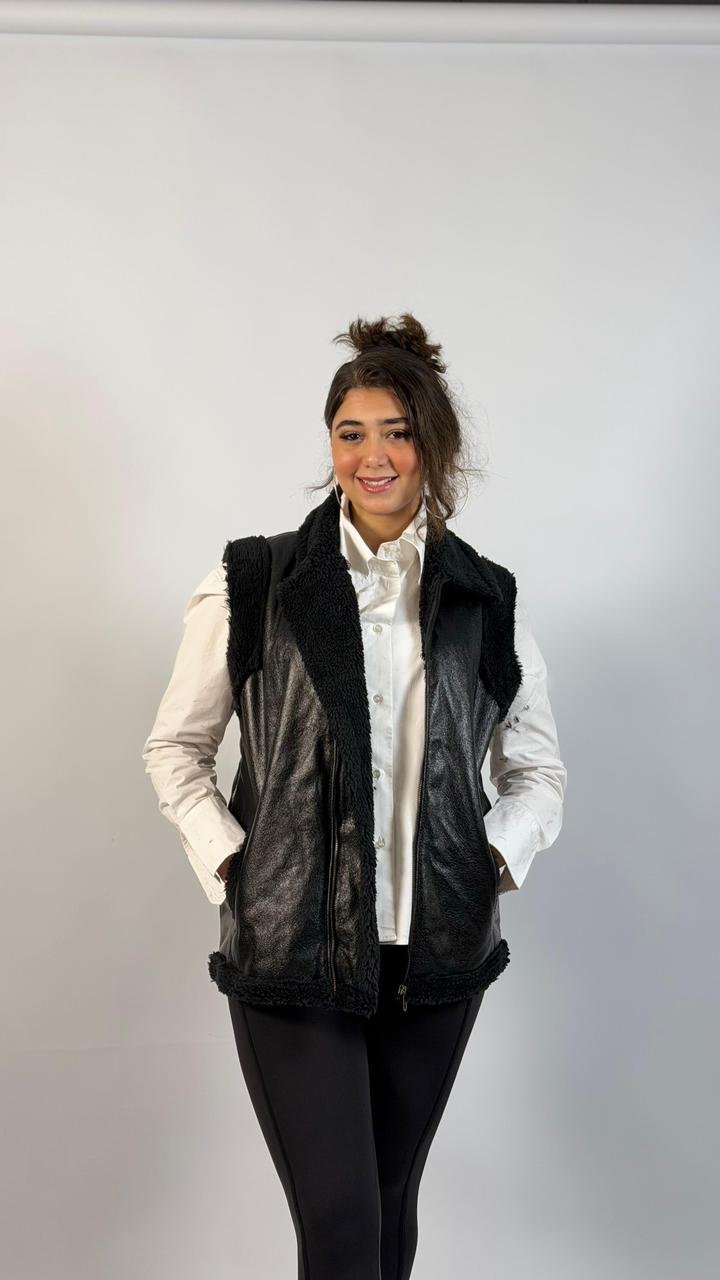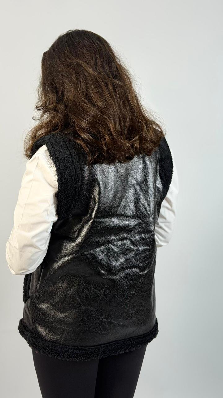 Chic black faux leather vest with soft shearling lining and collar, featuring a front zip closure and side pockets for a stylish yet cozy layered look.