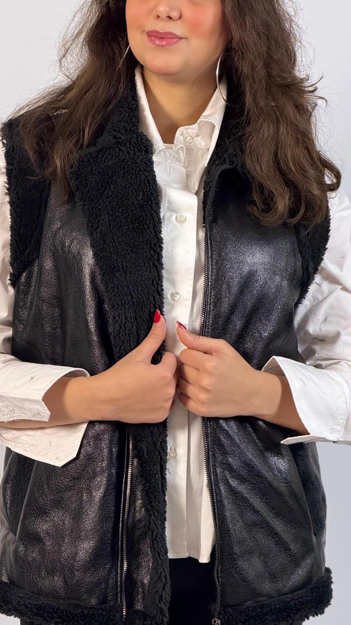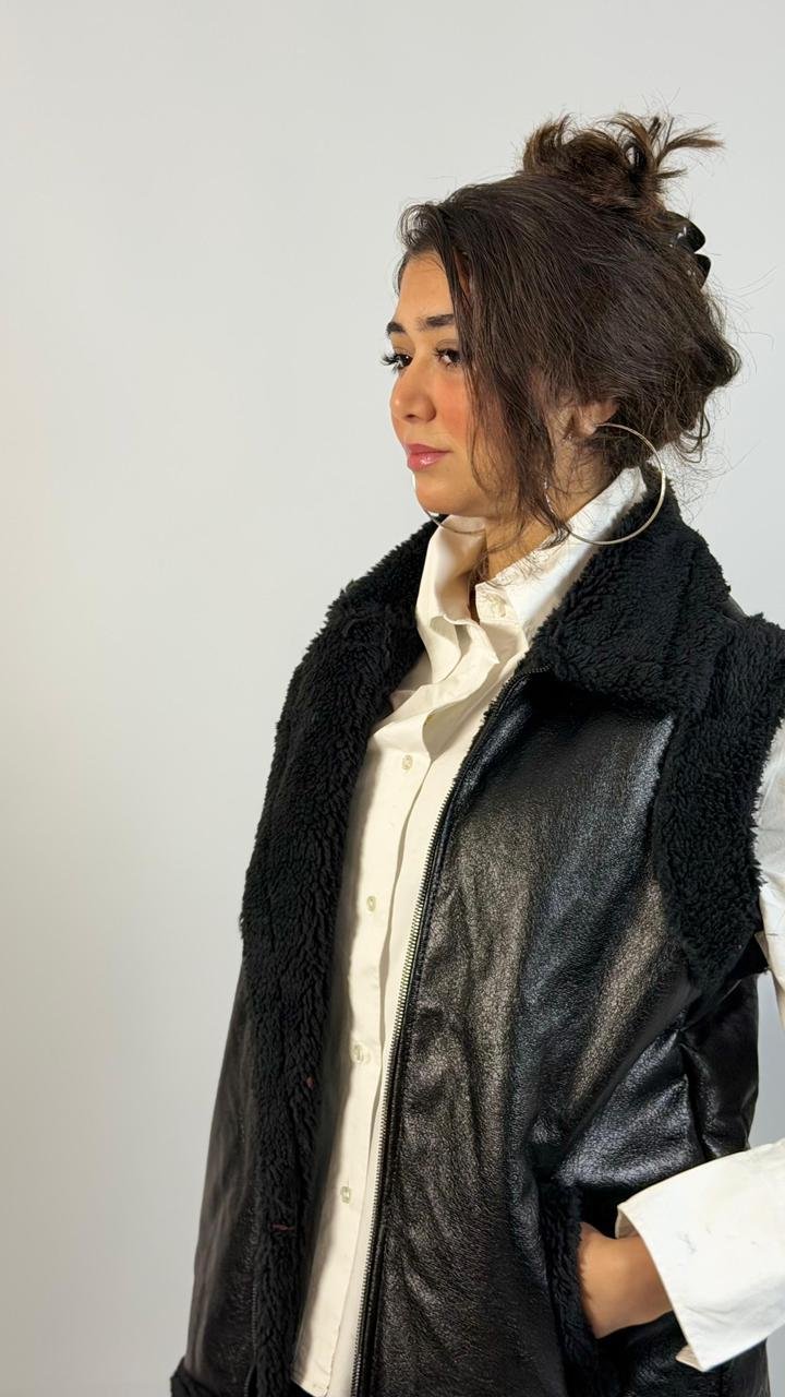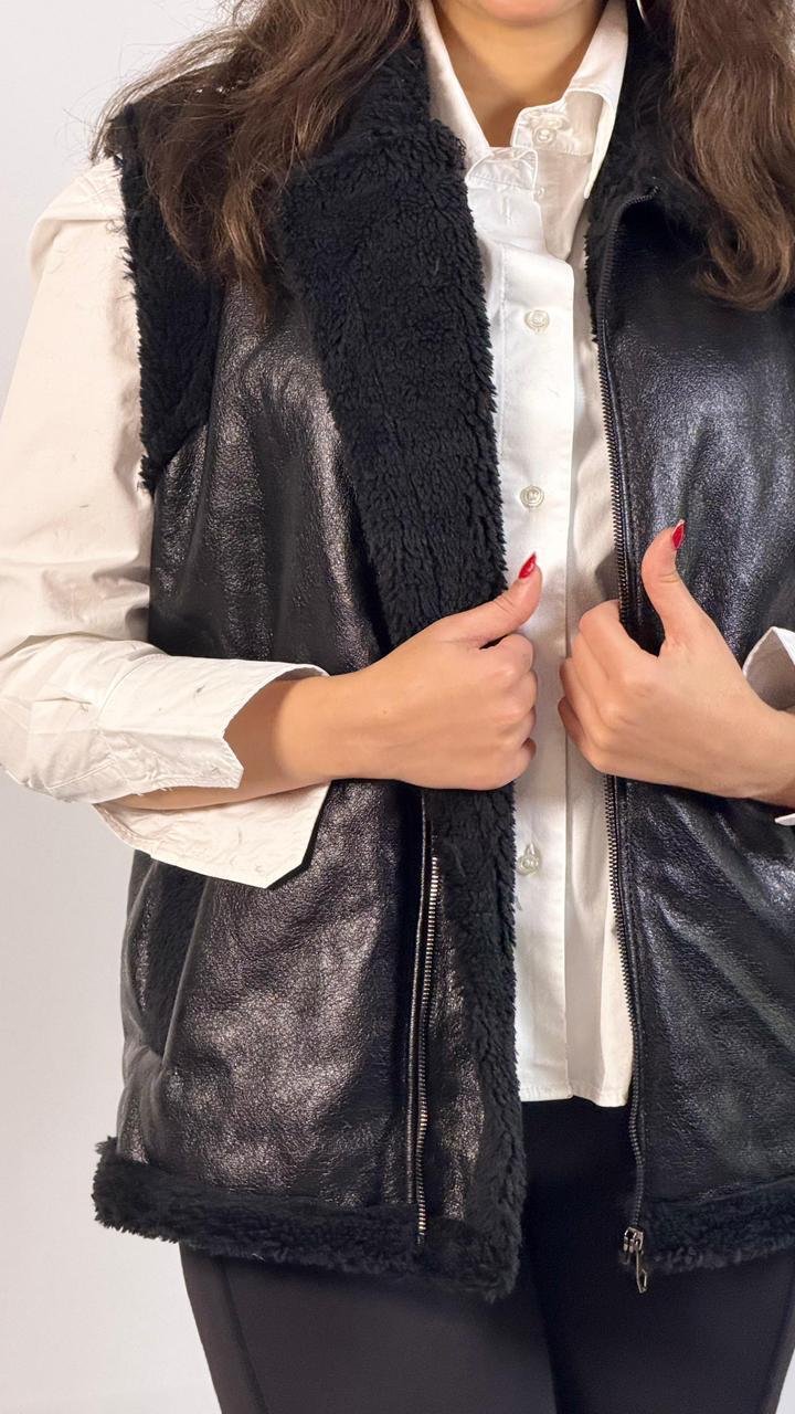 Chic black faux leather vest with soft shearling lining and collar, featuring a front zip closure and side pockets for a stylish yet cozy layered look.