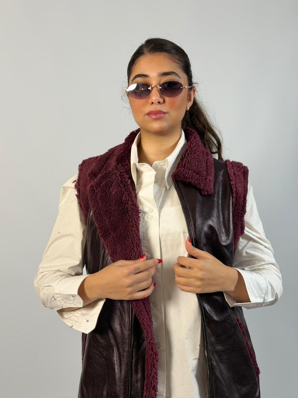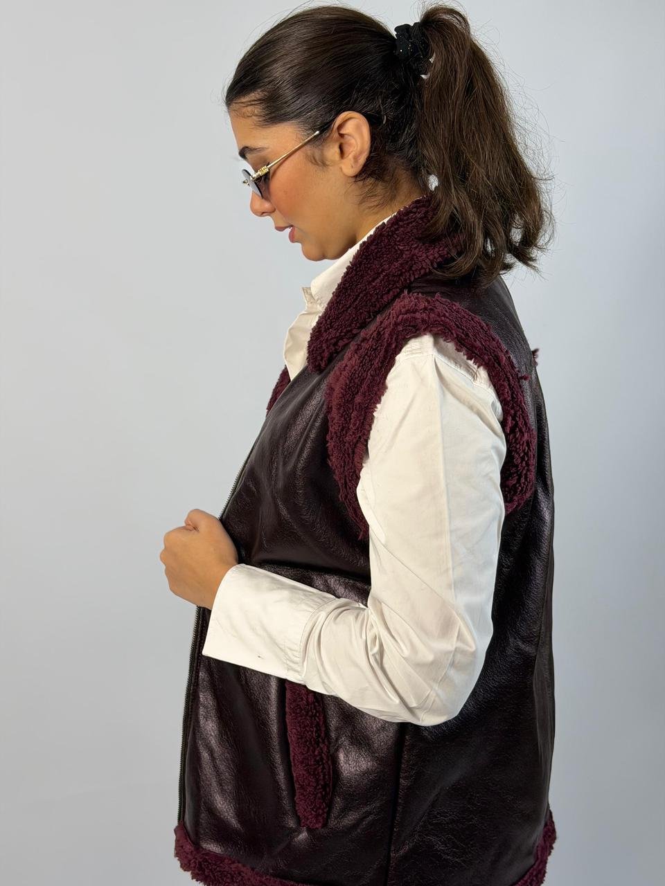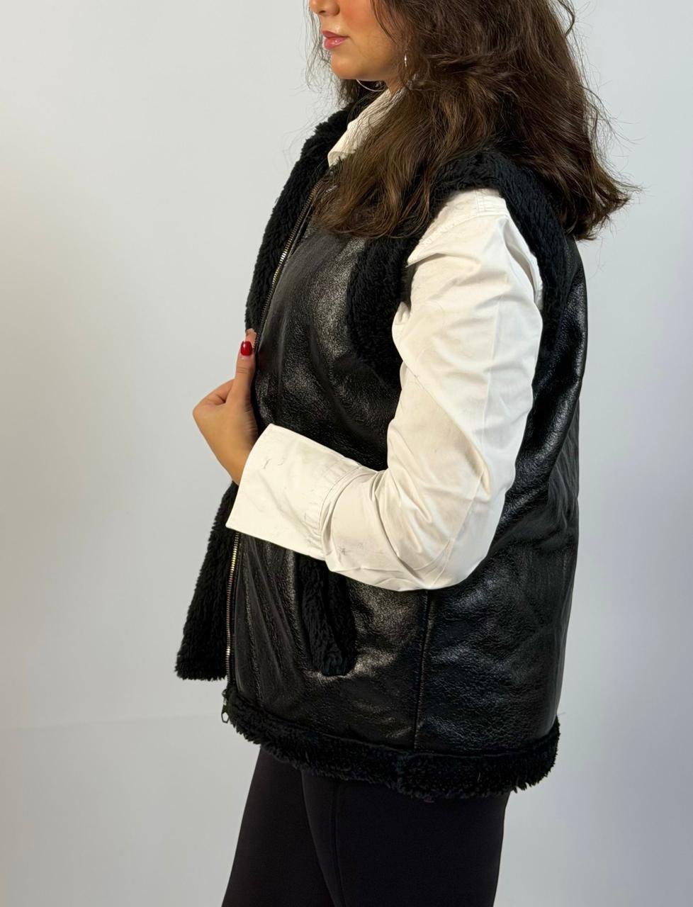 Chic black faux leather vest with soft shearling lining and collar, featuring a front zip closure and side pockets for a stylish yet cozy layered look.